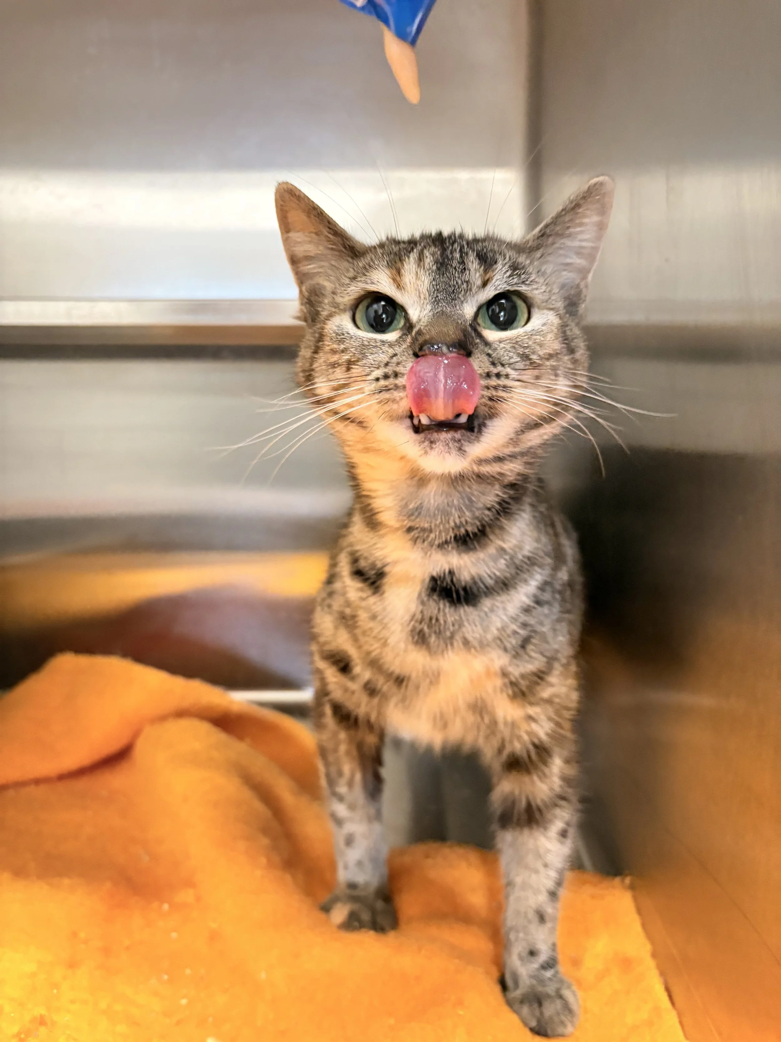 Look at that tongue! When Shyla came into the shelter with her siblings they were under socialized. We quickly found out what wins her over, Churus! With the help of our volunteers, Shyla is now less stressed, and loves attention!