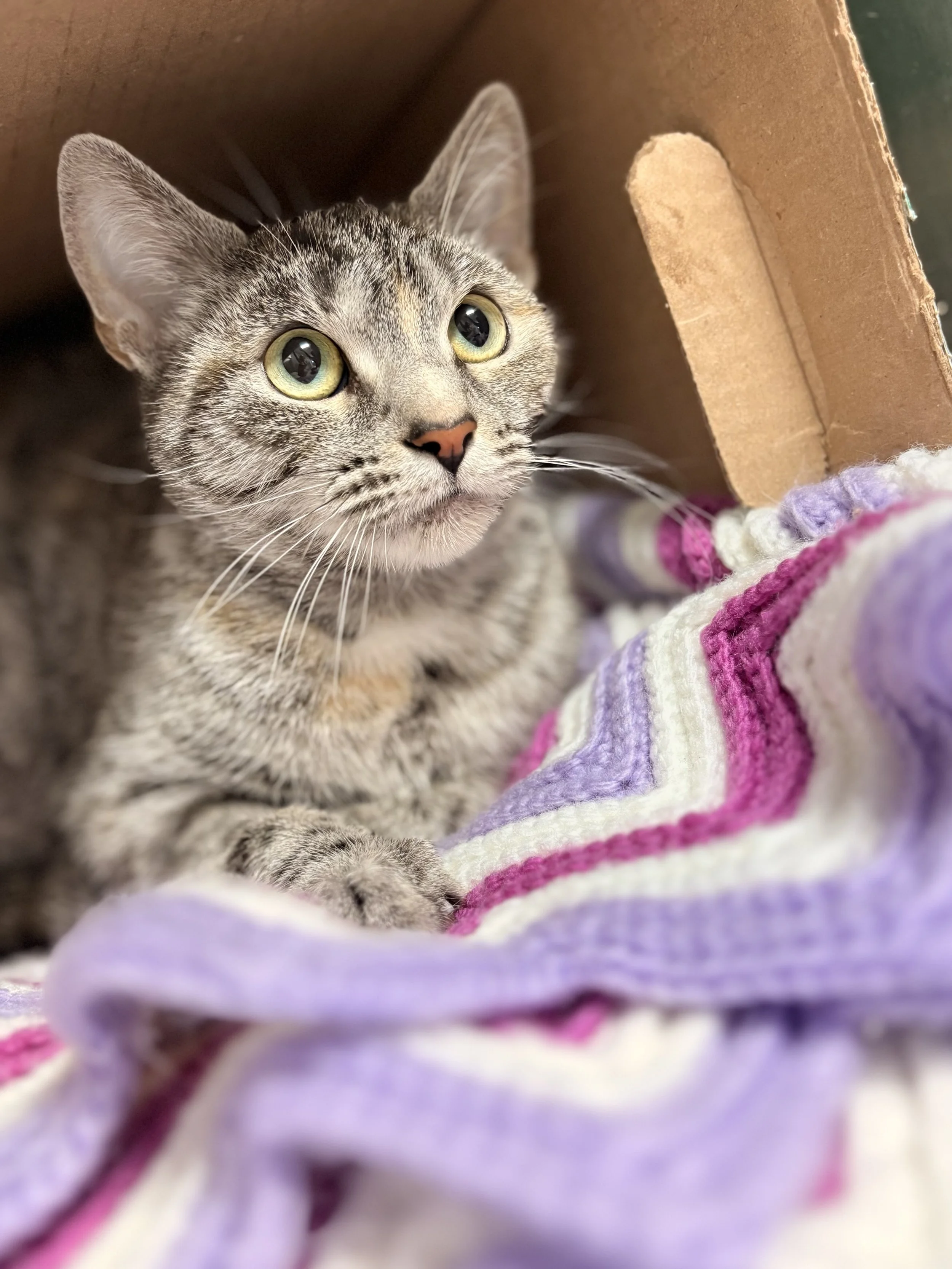 When swirl arrived to the shelter with her siblings, she was very shy and not well socialized. After a short period of time, swirl learned she loves attention! Our volunteers spent some time socializing swirl and now they are very accepting of love and pets.