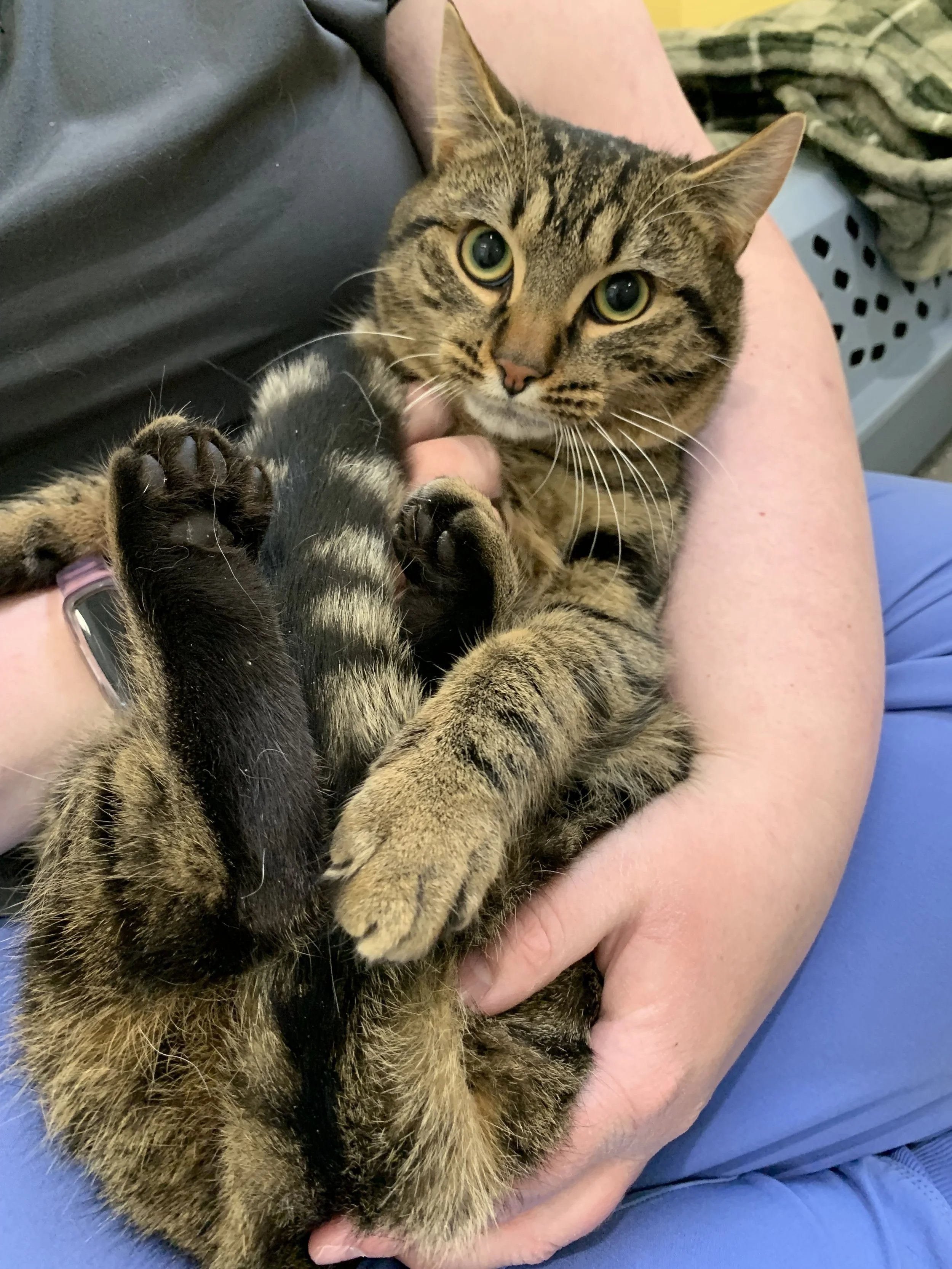 This shy little guy is looking for a family to help him feel safe and gain confidence. Peep is approximately 1 year old. He was born outside to a feral cat. Although he isn't very used to being indoors, he had been handled, socialized and cared for by a caretaker since he was a kitten. He may always be a little why when new people arrive but he will warm up to the right person. He is okay to handle and pick up and will try and snuggle and hide in your arms. He is being neutered on Friday and will be able to go home once healed.